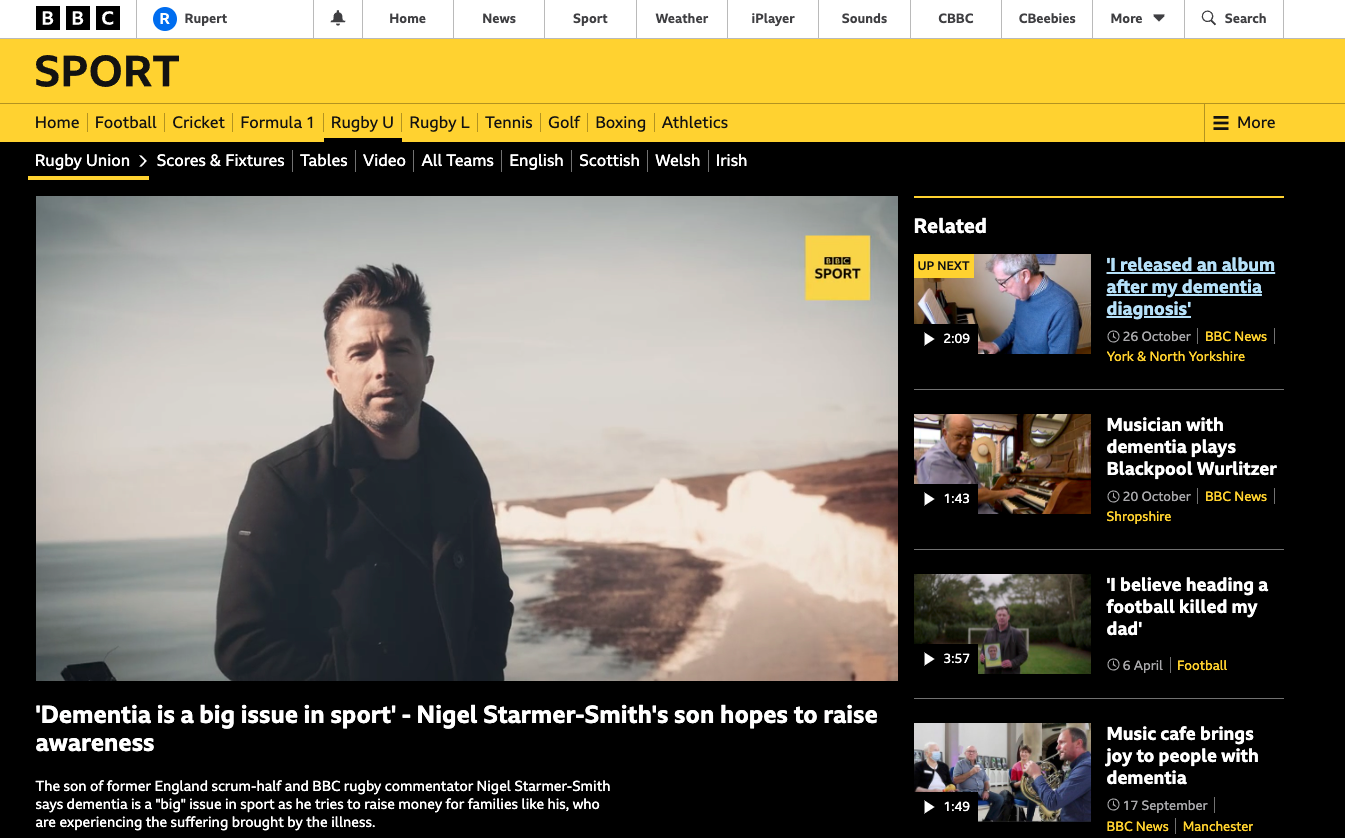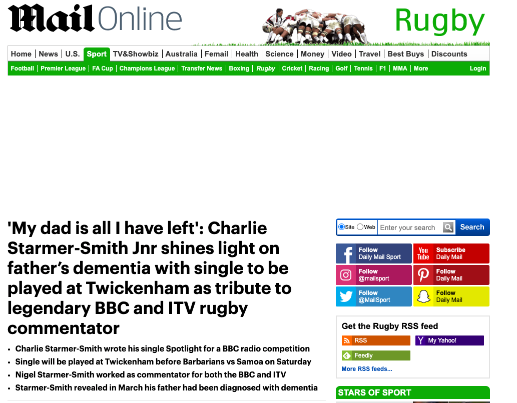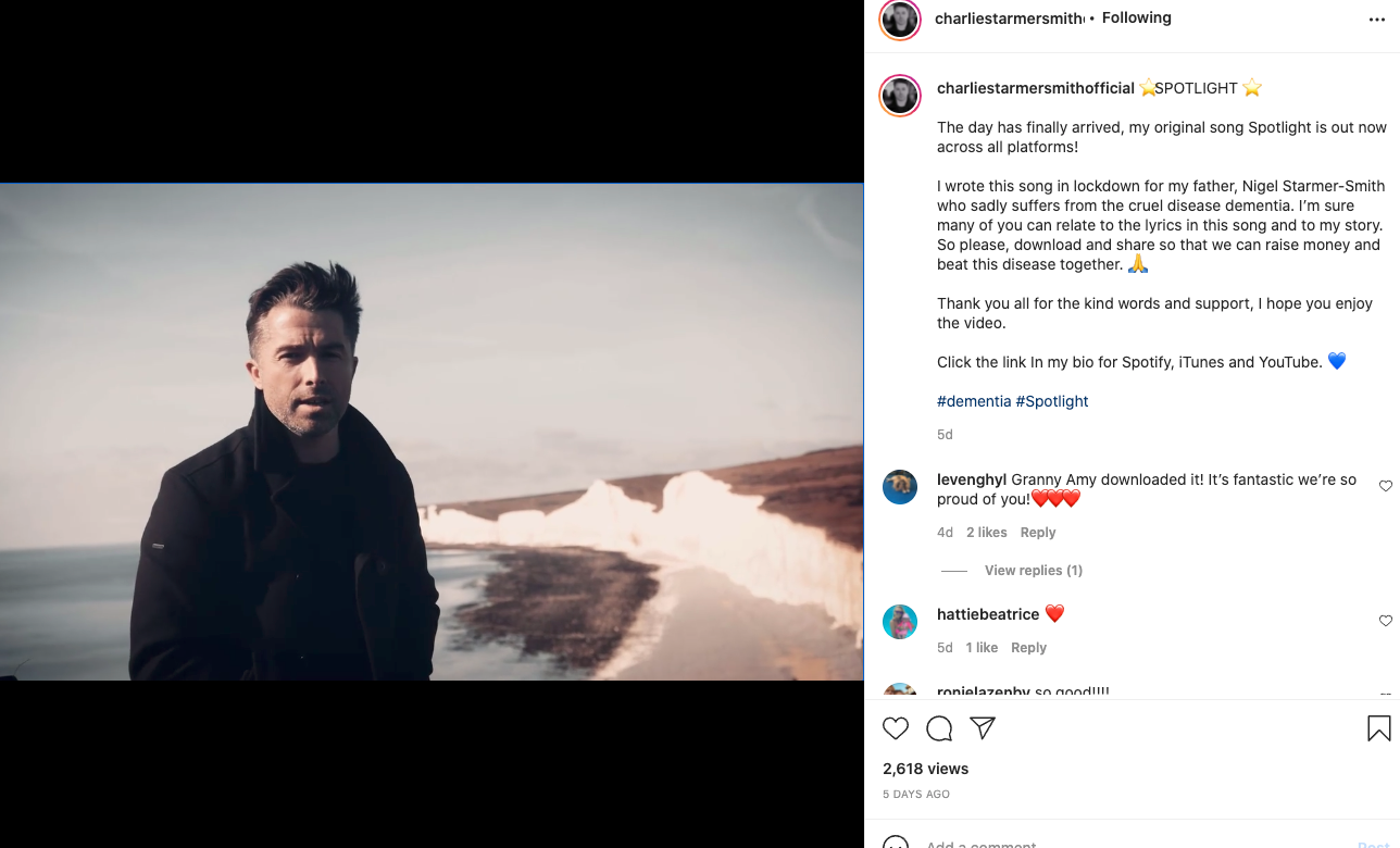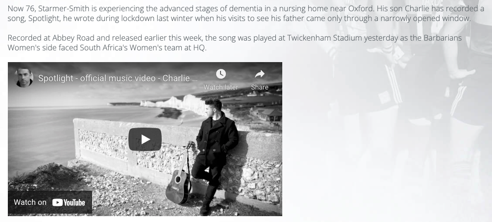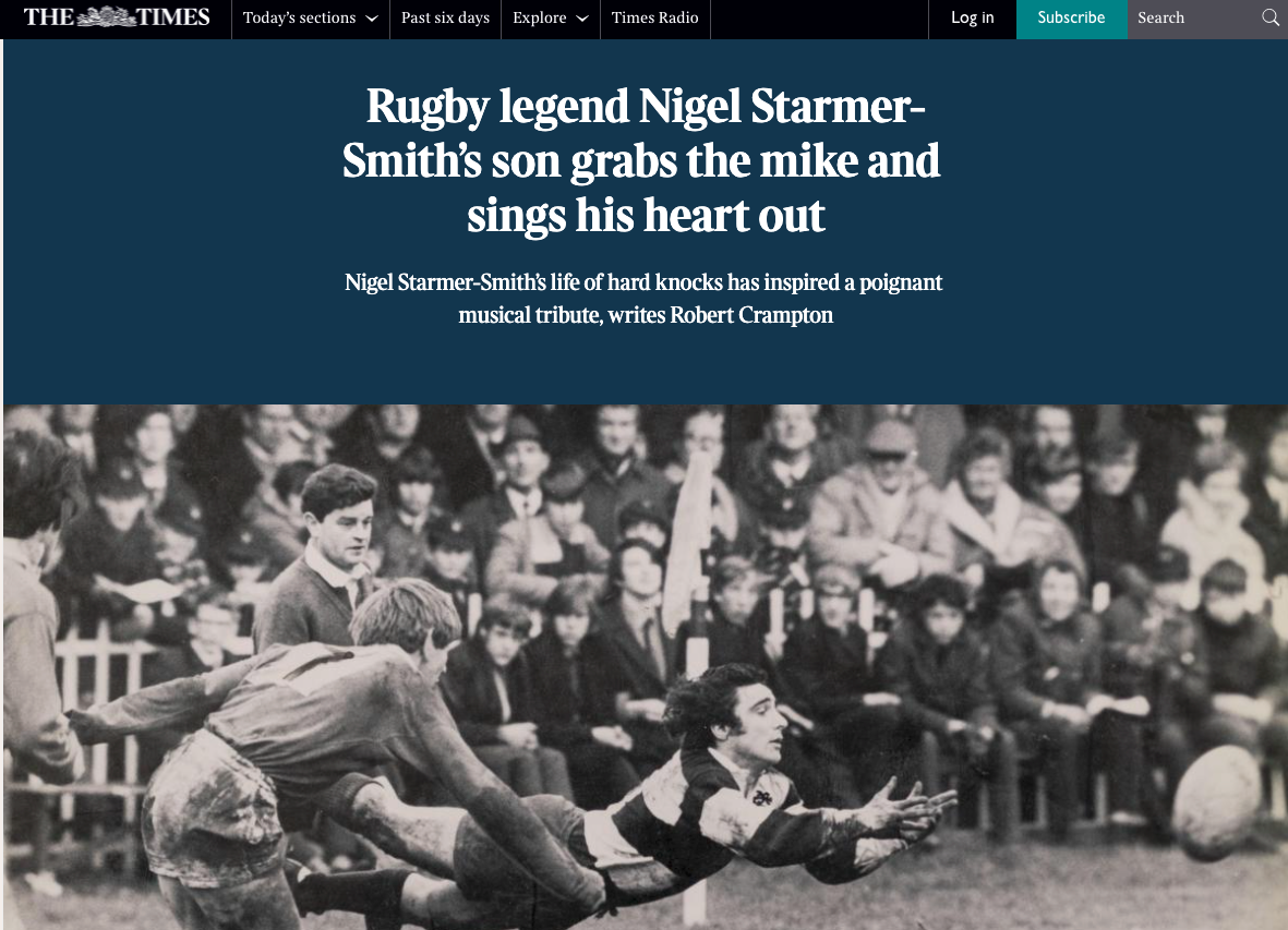 Charlie Starmer-Smith writes a song, Spotlight, in honour of his father, Nigel Starmer-Smith, former English Rugby player and BBC commentator.